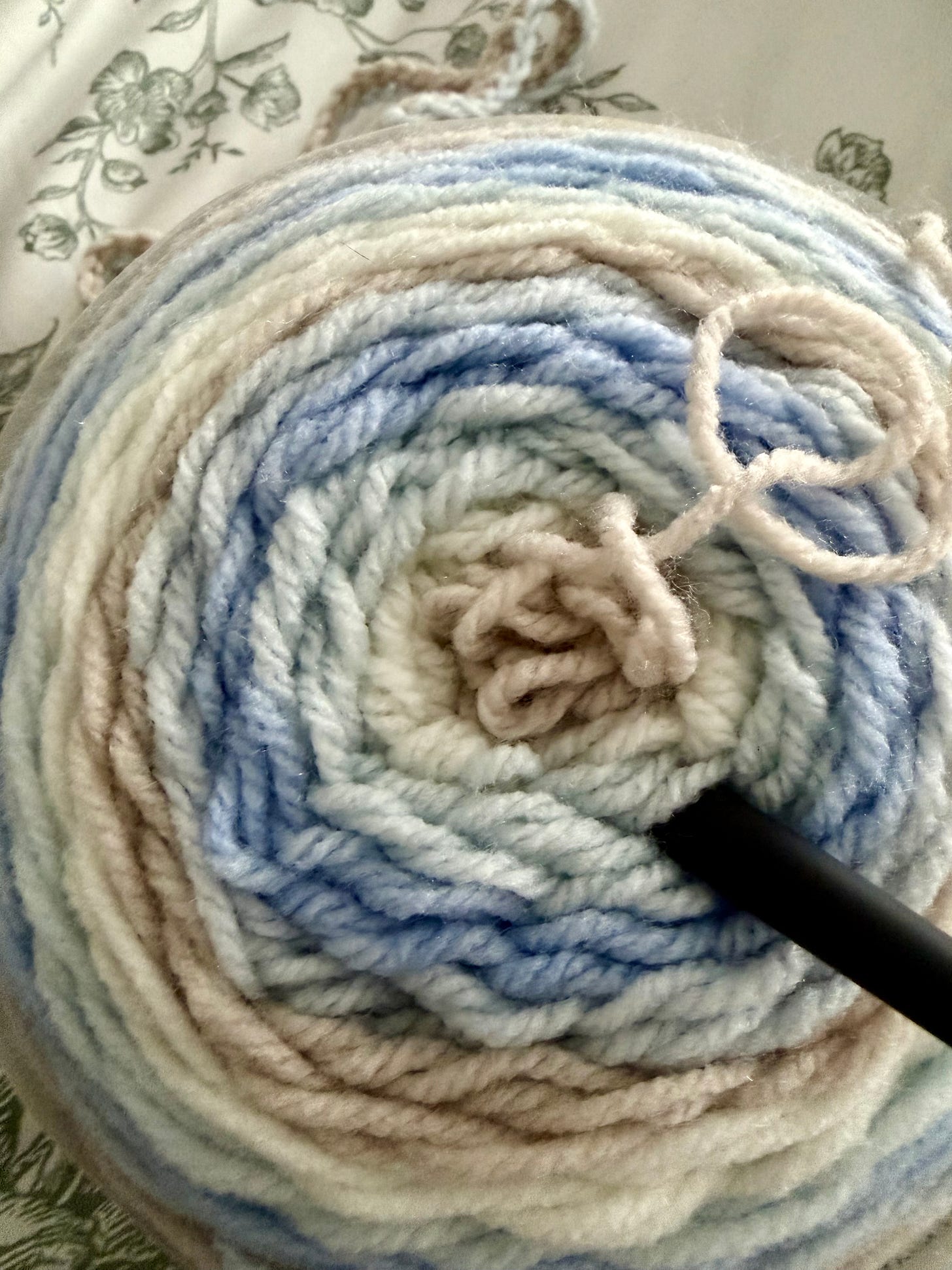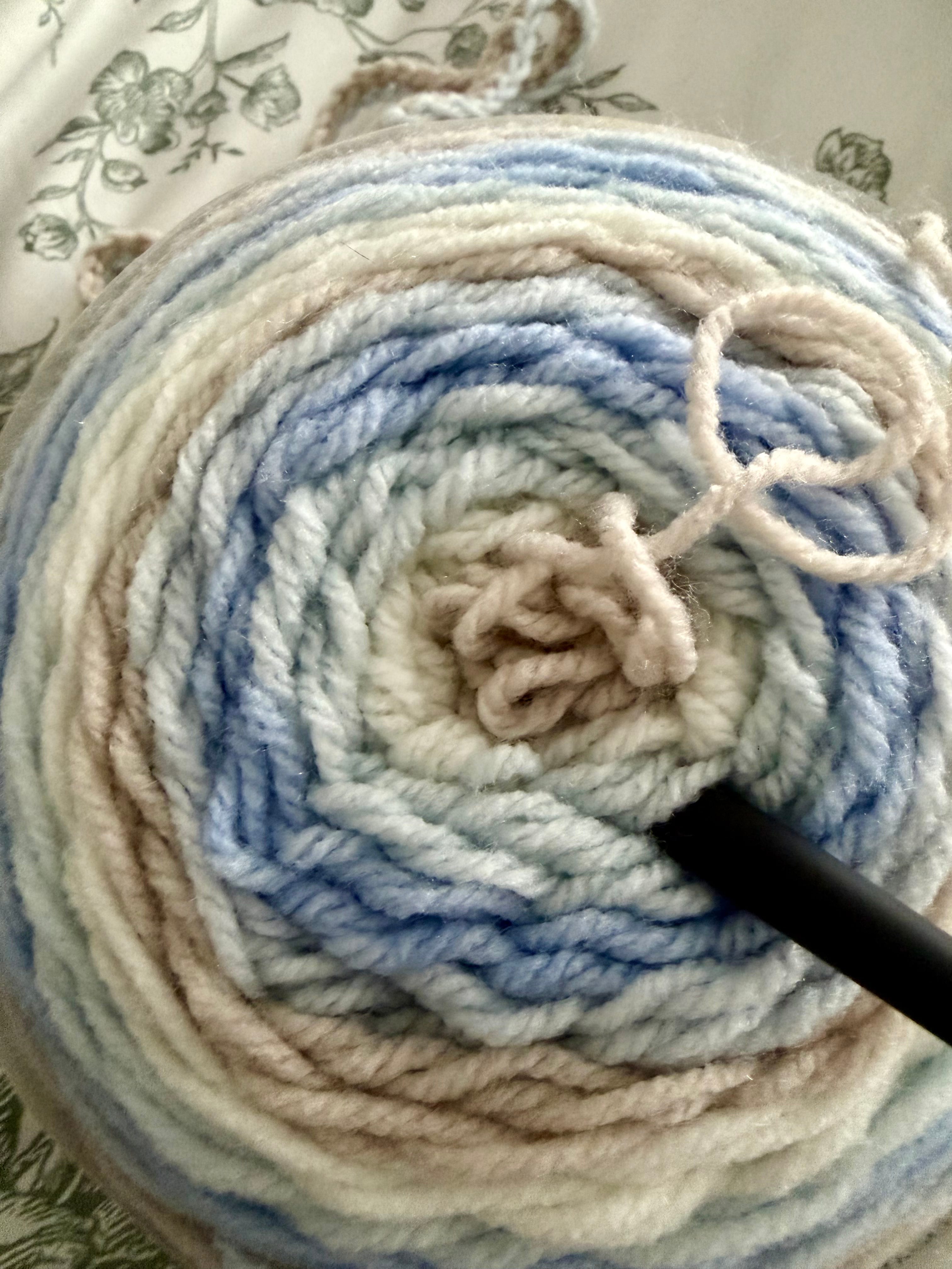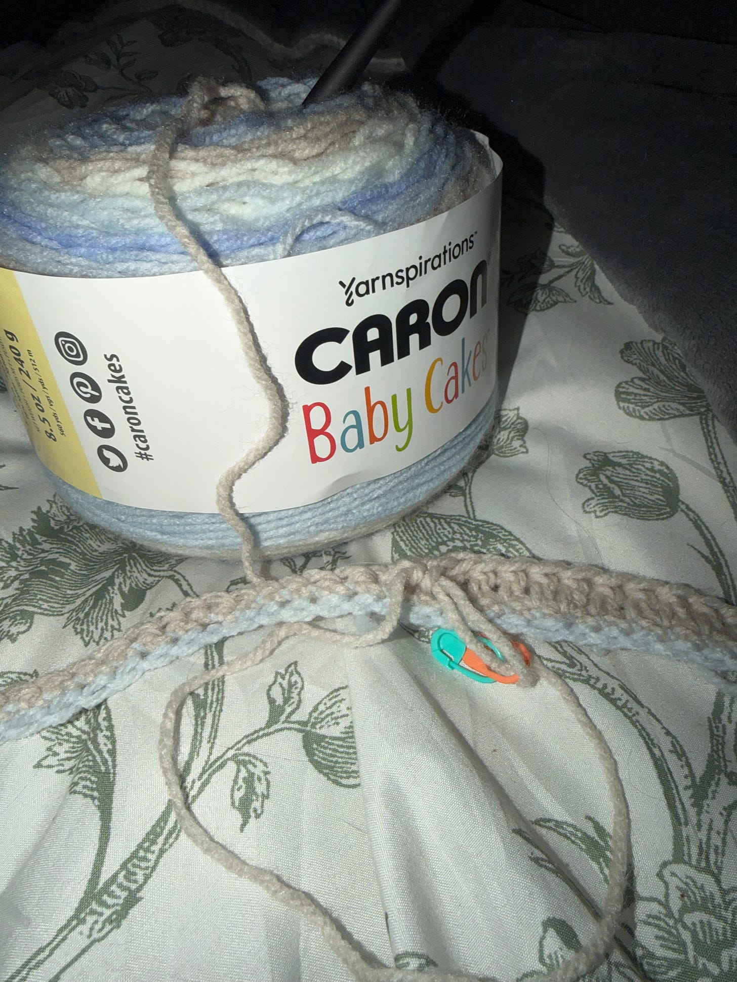 I sit now on the comforter of my bed, not ready to wake up officially, but with ideas buzzing around my head like uncomfortable late summer flies. I see the “cake” (that’s what it’s called) of yarn. This particular brand is called “Caron Baby Cakes”.
